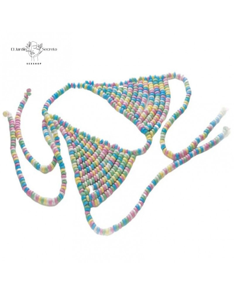 Este sujetador está adornado con deliciosos caramelos comestibles, tejidos en una banda elástica resistente y duradera, con un corte triangular que realza tus zonas más sensibles.
