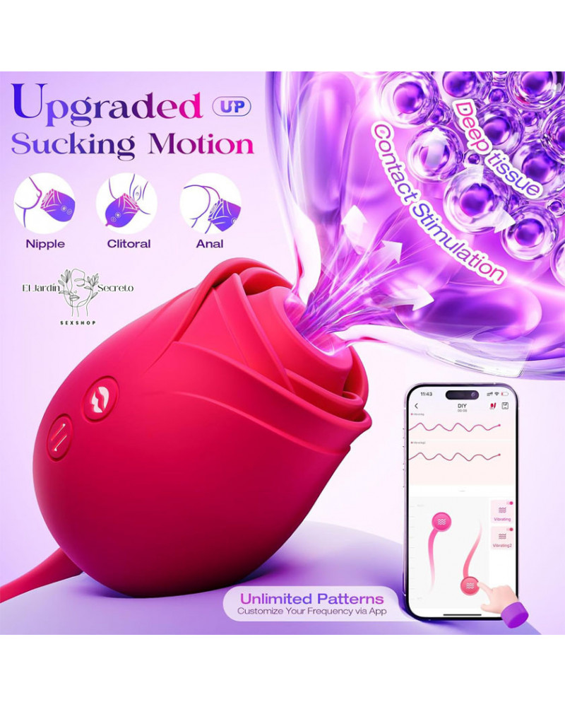 Vibrador en forma de una rosa con succión de clítoris y empuje punto G. Control por app, placer dual intenso y orgasmos profundos.